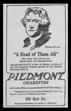 In spring 1910, the American Tobacco Company began a newspaper-ad campaign, "A Head of Them All," for its Piedmont brand of cigarettes. The campaign consisted of 26 different advertisements, each depicting a prominent figure in American history. Each ad featured the bust of a subject with a line describing his important contribution to U.S. history.